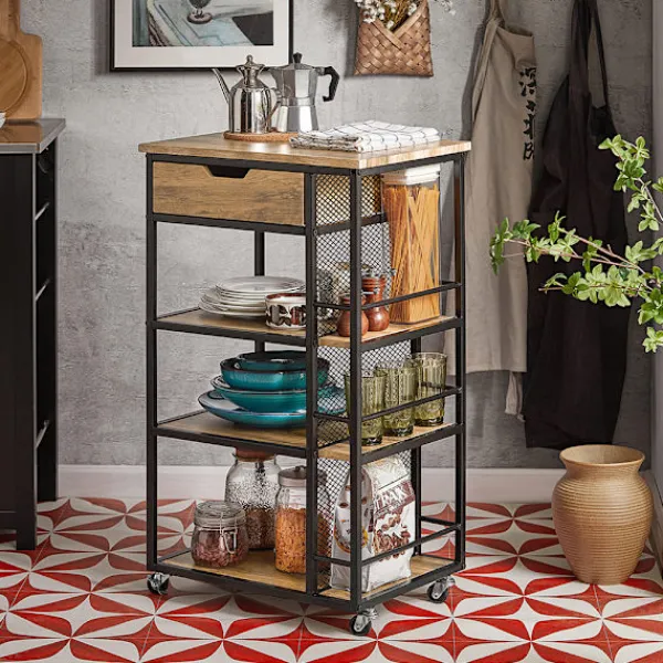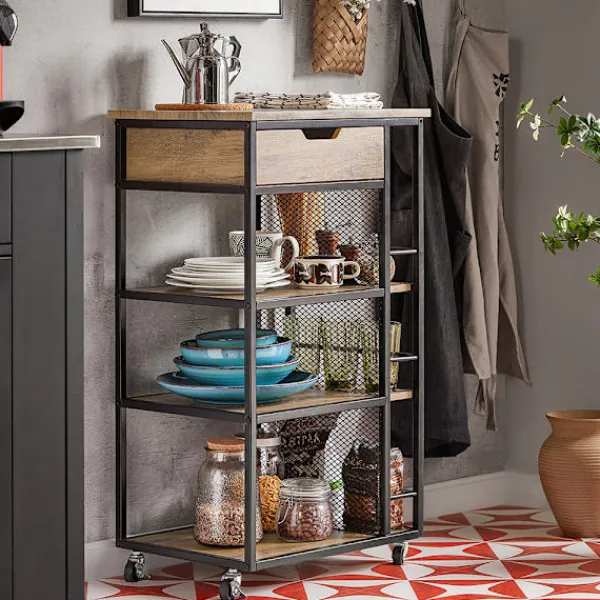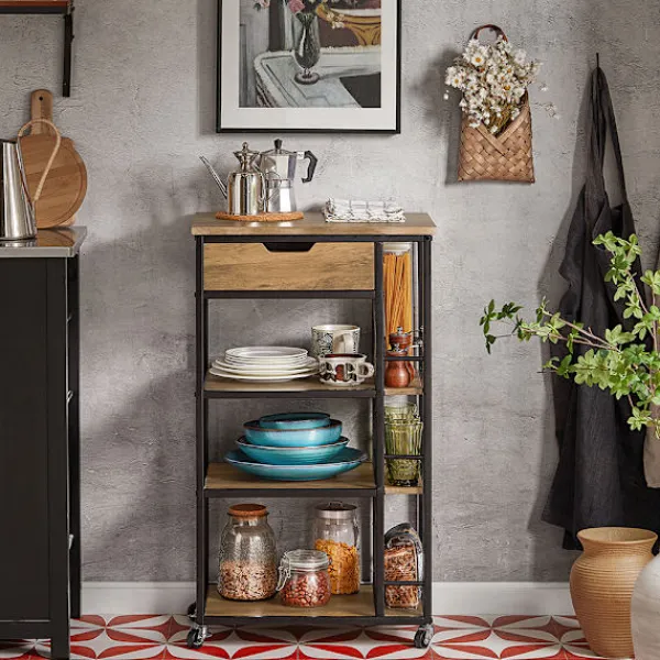 Denna köksvagn erbjuder en perfekt blandning av stil och funktionalitet. Med sina tre öppna förvaringsfack och stabila design kan du enkelt organisera och förvara köksredskap, servis eller drycker. De säkra tvärbalkarna förhindrar att föremål glider ut. Dess kompakta mått gör den idealisk även för mindre utrymmen, samtidigt som den tål en last på upp till 45 kg. Vagnens tidlösa färgkombination ger ett varmt och inbjudande intryck som smälter in i de flesta inredningsstilar.