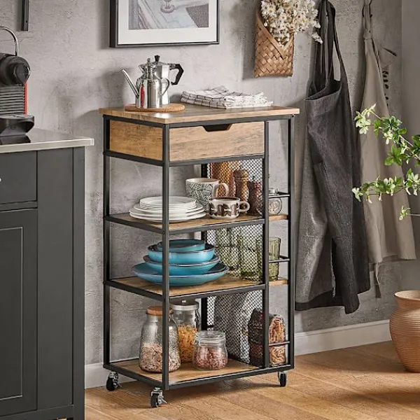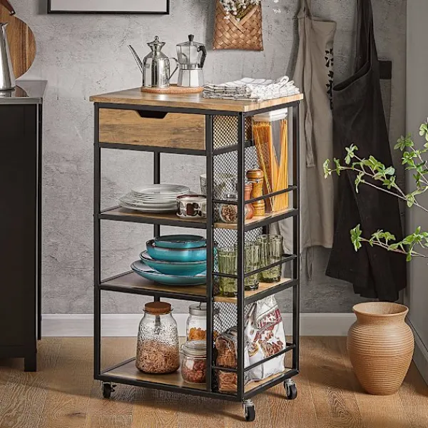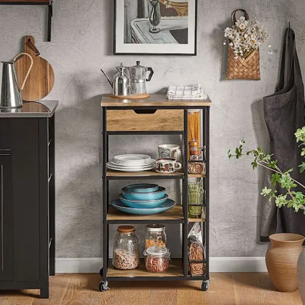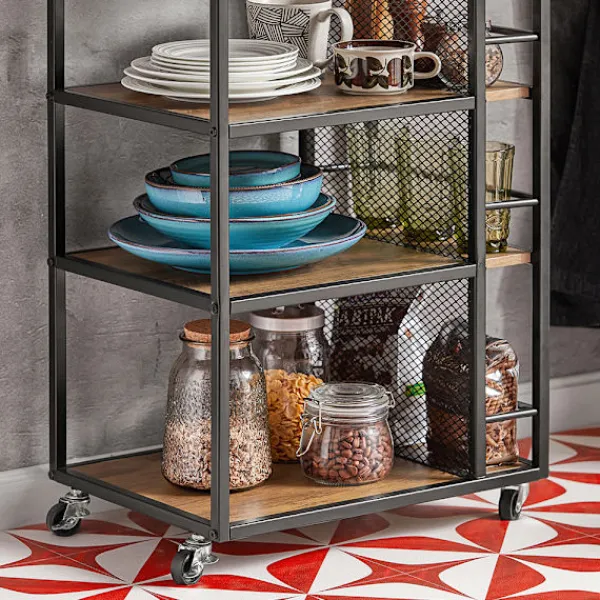 Denna eleganta serveringsvagn kombinerar trendiga vintage-bruna och mattsvarta färger för ett unikt utseende. Perfekt för hemmet, uteplatsen eller restaurangbruk.