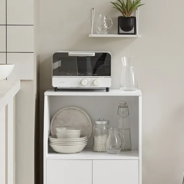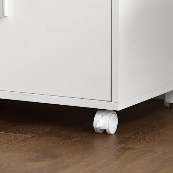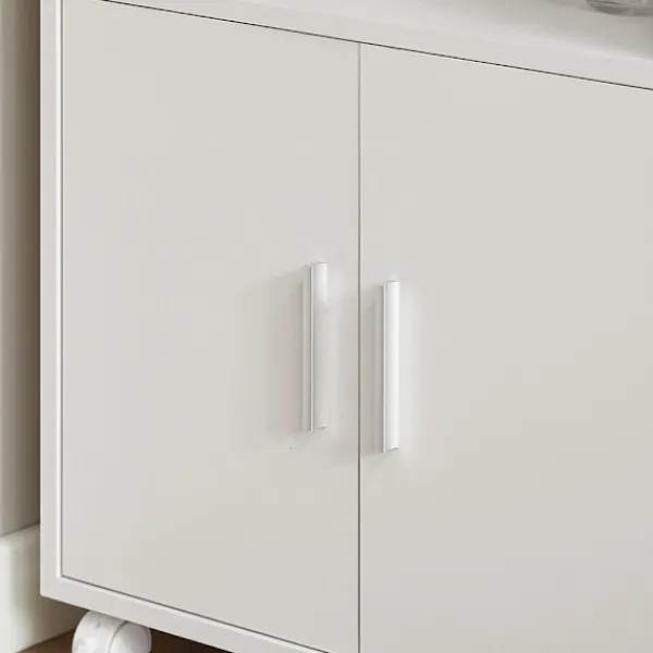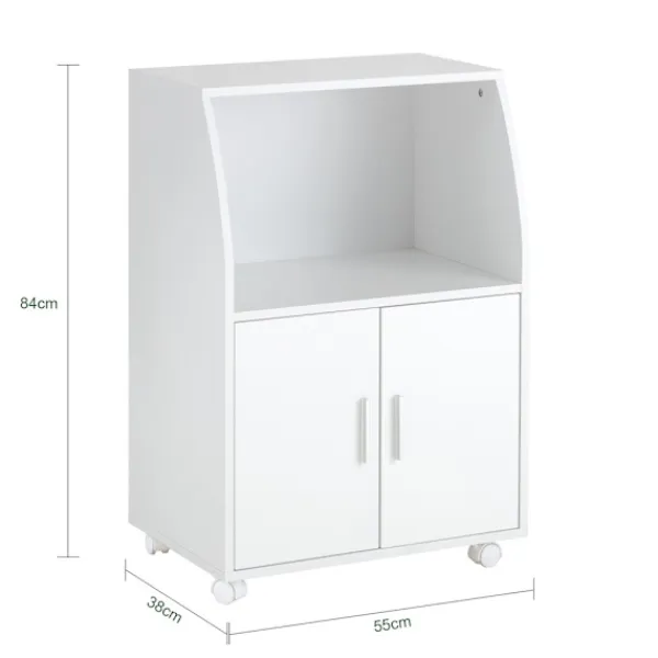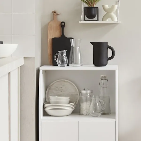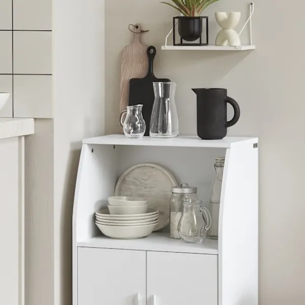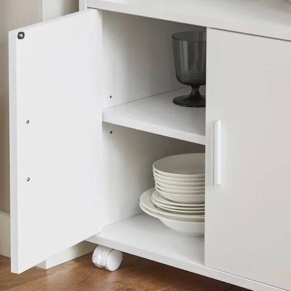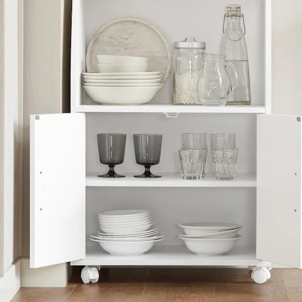 Köksvagnen erbjuder ett välkommet extra förvaringsutrymme i köket. De två fasta hyllorna och de två lådorna med smidiga löpare ger plats för olika kökstillbehör. Ett stort förvaringsfack med två dörrar gör det lätt att organisera och hålla reda på dina saker. Det invändiga hyllplanet kan justeras mellan tre olika höjder, vilket ger flexibilitet för att lagra föremål av varierande storlek.