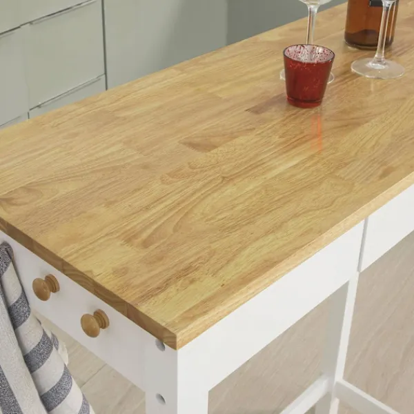 Bänkskiva med tjockt hevea faner, ett slitstarkt naturmaterial som kan slipas och ytbehandlas vid behov.