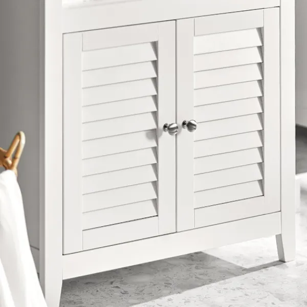 Denna kommod erbjuder generöst förvaringsutrymme för dagliga vårdprodukter och småsaker. De luftcirkulerande lamelldörrarna förhindrar mögeltillväxt i skåpet, vilket gör den särskilt lämplig för badrum. Den stabila konstruktionen med högkvalitativa paneler garanterar pålitlig stabilitet och en lastkapacitet på upp till 45 kg. Det minimalistiska utseendet med rena linjer integreras sömlöst i olika inredningsstilar.