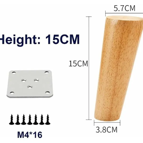 Tillgänglig höjd: 15 cm. Paketet innehåller: 4x trämöbelben, 4x järnplattor, 28x skruvar.