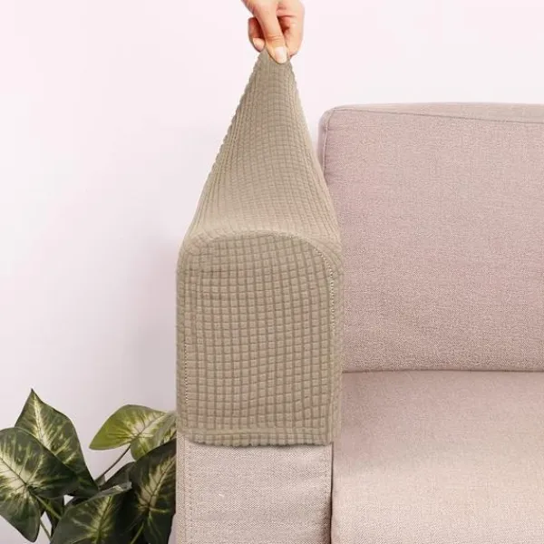 【Halksäkra mönster】: Tjockt tyg kan öka friktionen. Tygsoffan kan fästas med knappar. Setet innehåller 10 vridstift för att bättre säkra armstödsskydden. Osynlig design, du kan sätta in dem i soffans arm utan att riva soffan.
