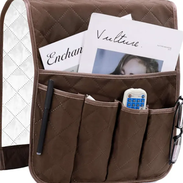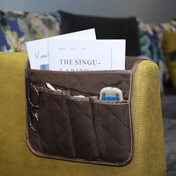 Brun Armstödsorganiserare för fåtölj, Skyddande överdrag för soffa, Hängande fickor för att spara utrymme, Halksäker förvaringsväska för telefon, bok, tidningar, TV-fjärrkontroll,