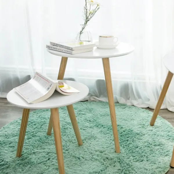 Detta satsbord i två delar kombinerar modern skandinavisk design med praktisk funktionalitet. De runda bordsskivorna i vitt kompletteras av stilrena ben i massivt furu, vilket skapar en naturlig och harmonisk känsla i hemmet. Tack vare den minimalistiska utformningen passar borden lika bra i vardagsrummet som på balkongen, vid sängen eller som växtpallar.