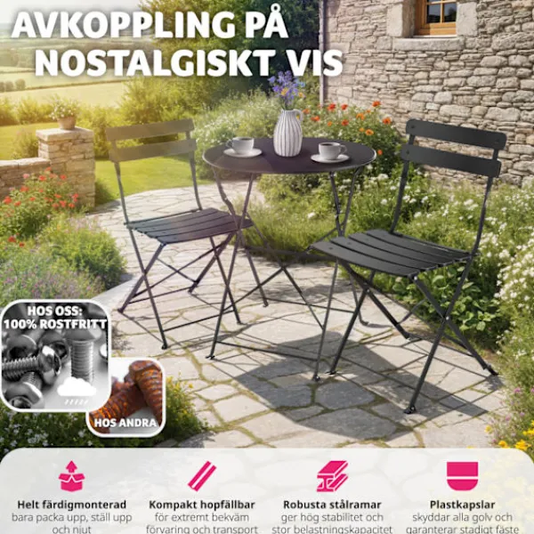 - Förmonterat bistroset med bord och 2 stolar i lamelldesign