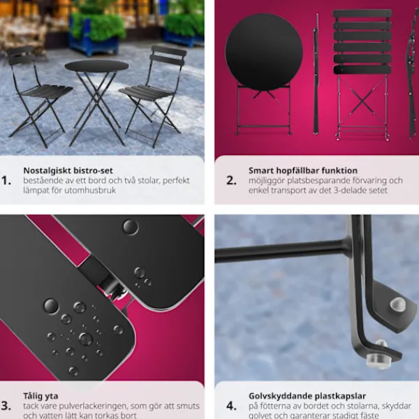 Med sin hopfällningsfunktion kan du enkelt förvara eller transportera möblerna. Ingen montering behövs, och de solida, pulverlackerade stålramarna ger både hållbarhet och stabilitet. De halkfria fotkåporna skyddar golvet.