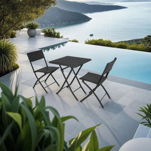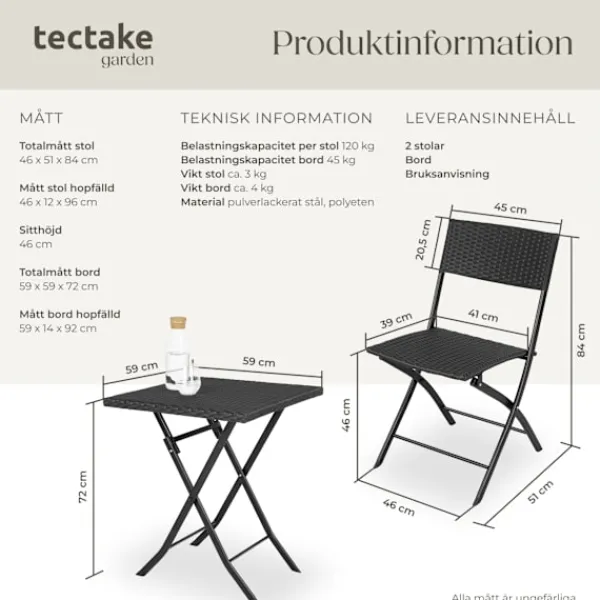 Denna cafégrupp i tre delar från Tectake övertygar med elegant utseende, hög flexibilitet och komfort. Den kompakta möbelgruppen passar utmärkt till små balkonger, terrasser eller altaner. När cafégruppen inte används kan de enskilda delarna fällas ihop för att ta lite plats. Bordet samt de båda stolarna är tillverkade i pulverlackerat stål och det fina flätade material av slitstark polyrotting levereras färdigmonterade. Kombinationen av en robust bas och låg vikt gör detta rottingset från Tectake perfekt för transport och för camping.