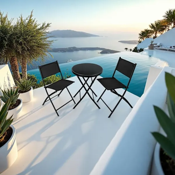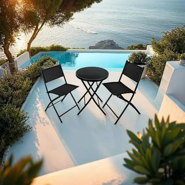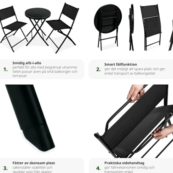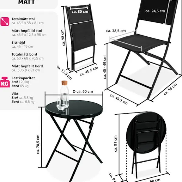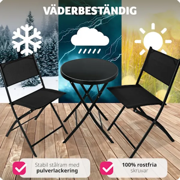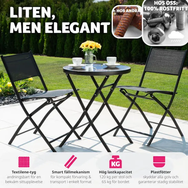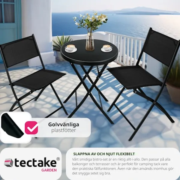 Skapa snabbt en mysig uteplats av ett mindre utrymme med detta funktionella caféset från tectake. De extremt slitstarka textilfibrerna är luftgenomträngliga och garanterar utemöblerna en behaglig och sval sittkomfort även i varma temperaturer. Sittgruppens mest utmärkande funktion är dess flexibilitet: monteringen och demonteringen görs med några enkla steg. Dess låga vikt och hopfällbara funktion gör trädgårdsmöblerna idealiska för transport och platsbesparande förvaring. Den robusta stålramen ger samtidigt sittgruppen en hög stabilitet. Fäll upp möblerna, sätt dig ner och njut i ett lättskött caféset från tectake.