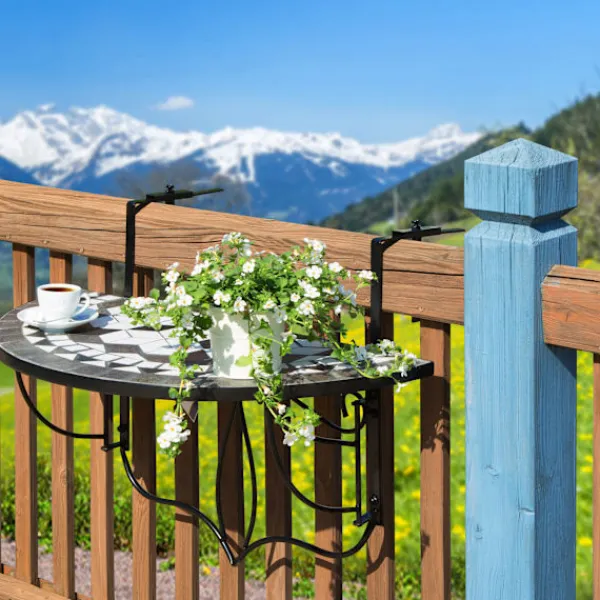 På detta balkongbord från tectake har du alltid vad du behöver för en lyckad sommardag inom räckhåll. Den stabila konstruktionen med två metallkrokar kan enkelt hängas upp på ett balkongräcke. Den halvcirkelformade bordsskivan med mosaikmönster utstrålar en medelhavskänsla och erbjuder gott om utrymme. Efter användning kan hängbordet fällas ner för att ta mindre plats. En oumbärlig accessoar för en semester på balkongen: Ditt nya praktiska balkongbord från tectake.