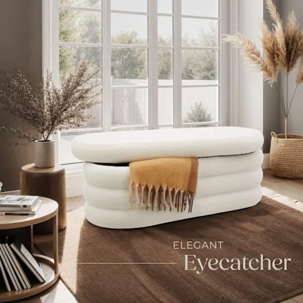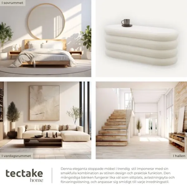Den vadderade sittbänken med förvaring Altu, med Bouclé-överdrag från tectake är mer än bara en praktisk sittplats. Den kombinerar en ombonande design med högsta funktionalitet och är det perfekta komplementet för alla som välorganiserat och stilfullt hem. Oavsett om det är i vardagsrummet, hallen eller sovrummet – denna bänk smälter harmoniskt in i varje rum.