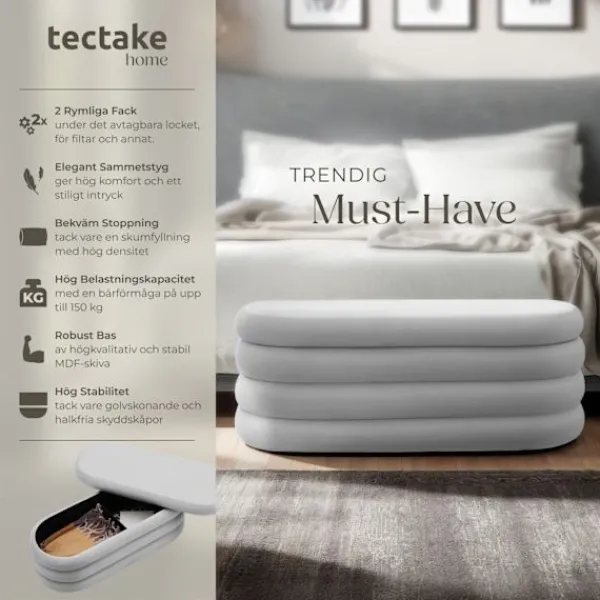 Den vadderade sittbänken med förvaring Altu, med sammetstyg från tectake är mer än bara en praktisk sittplats. Den kombinerar en ombonande design med högsta funktionalitet och är det perfekta komplementet för alla som välorganiserat och stilfullt hem. Oavsett om det är i vardagsrummet, hallen eller sovrummet – denna bänk smälter harmoniskt in i varje rum.