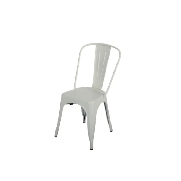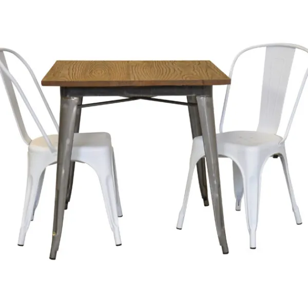Detta franskinspirerade set består av bord i galvaniserad plåt, med toppskiva i rustik, ruffig, mörkbrun alm. Till detta ingår 2 matt vita plåt stolar. En tuff blandning av färger.