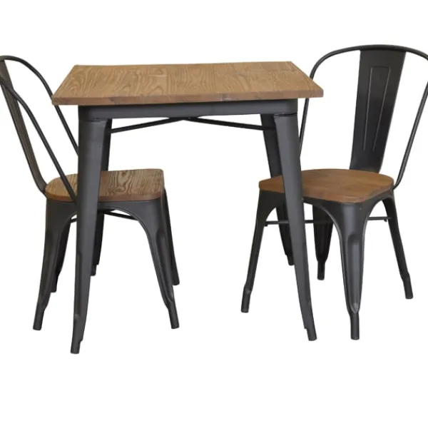 Detta franskinspirerade set består av bord med toppskiva i rustik, ruffig, mörkbrun alm. Till detta hör 2 stolar med trä sits i samma utförande. Ytan är matt.