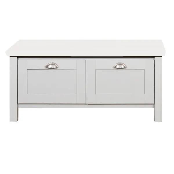 Denna bänk kommer omonterad men det medföljer en bra monterings beskrivning. Inne i skåpet är det mycket plats för div saker. Dörrarnas framsida har snygga handtag i köpmansdisk stil och materialet är MDF skivor som är lackerade.