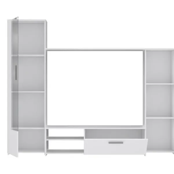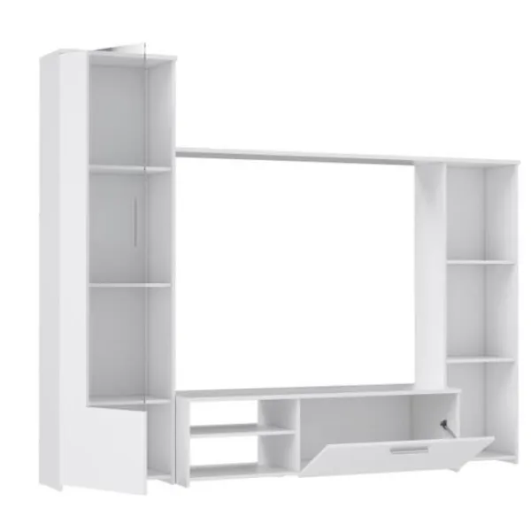 PILVI TV-skåp är en modern vardagsrumsmöbel med elegant design. Bestående av två sidoskåp i olika storlekar, en TV-enhet och en displayhylla, ger den tillräckligt med utrymme för att förvara dina multimediaenheter, DVD-spelare, mediabärare, böcker och alla typer av småsaker.