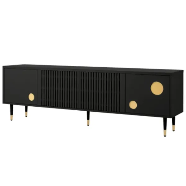 Utsökt design möter funktionalitet: Denna TV-bänk har fyra dörrar, två med moderna ribbor och två med gyllene accenter. Dess eleganta och stilfulla utseende kombinerar perfekt modern och klassisk stil.