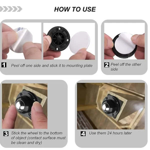 [Lastkapacitet]: 28 lbs per hjul. Totalt 110 lbs för 4 hjul. Hjulstorlek: Total höjd 24 mm (1 tum), monteringsplatta diameter 44 mm (1-3/4 tum), monteringshål diameter 4 mm, avstånd mellan diagonala hål 36 mm.[Låg profil och 360 graders rotation]: Lågprofilshjul lägger inte till för mycket höjd på möbler och kan ändå bära en hel del vikt. Större stålkulor i ABS-fäste rullar smidigare jämfört med andra små kulor.[Snabb och enkel installation] Installera svängbara hjul på fötterna/benen på t.ex. soffbord, hyllor, skåp, byråer, växtstativ med medföljande självhäftande dynor eller skruvar. Gör det enkelt och smidigt att flytta möbler. Tips: 1. Dessa hjulrullar fungerar endast på släta och hårda ytor, kan lämna spår på träytor. 2. Vi föreslår att du använder skruvar för att installera hjul för tunga föremål.[Bred tillämpning]: Inte bara för möbler utan även för förvaringslådor, arkivskåp, nattduksbord, förvaringslådor under sängen, verktygslådor, luftrenare, stående/tornfläktar och andra apparater…
