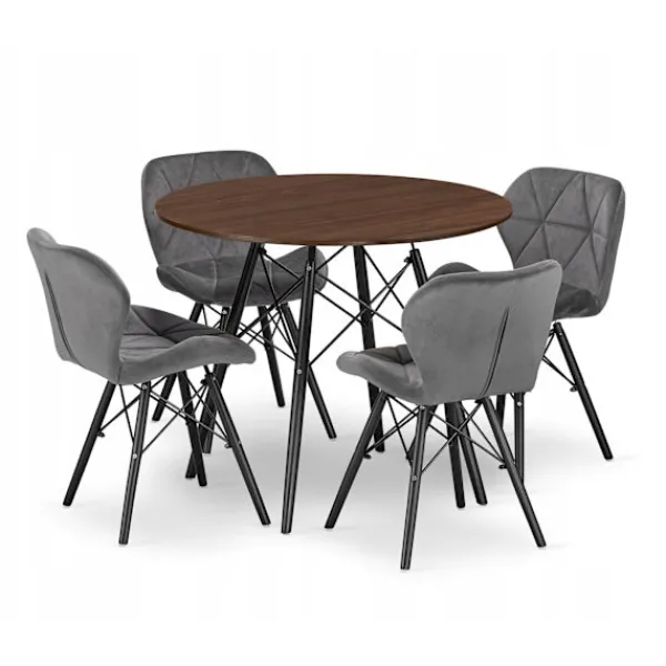 KOVA 80 rundbordsset med 4 grå WAKO-stolar erbjuder en modern design som förbättrar alla vardagsrum. Tillverkat av högkvalitativa material kombinerar detta set funktionalitet och hållbarhet, vilket gör det perfekt för ditt kök, matsal eller vardagsrum. Bordet har en askfärgad MDF-skiva, medan stolarna är klädda i mjukt sammetstyg, vilket ger komfort och stil.