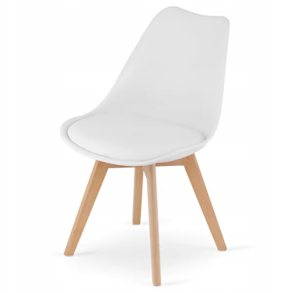Material: Bord – Möbelskiva med PVC-faner; Stolar – Polypropylen med kudde i eko-läder, ben i bokträ