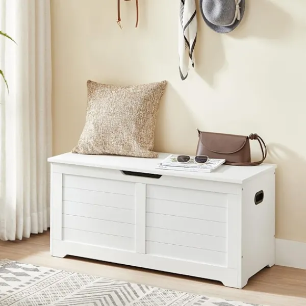 Bänken fungerar utmärkt som skobänk i hallen, som extra avlastningsyta i vardagsrummet eller som förvaring i sovrummet. Den robusta konstruktionen i spånskiva klarar upp till 100 kg, så du kan sitta bekvämt på den när du knyter skorna. Två gångjärn håller locket på plats och minskar risken att klämma fingrarna. Integrerade handtag gör den lätt att flytta.