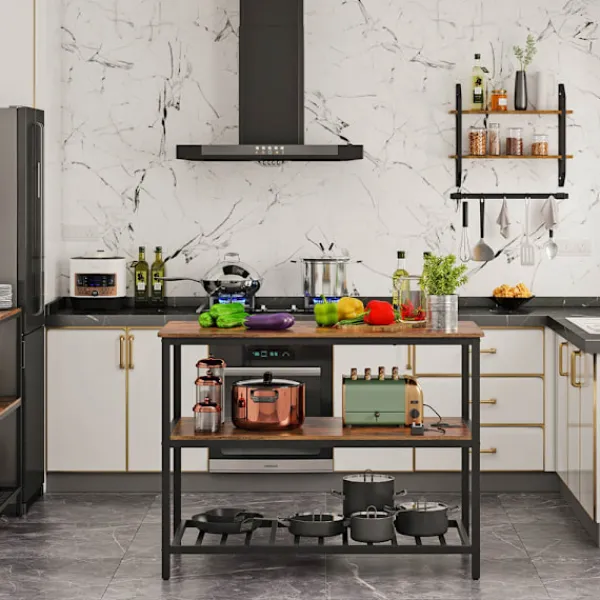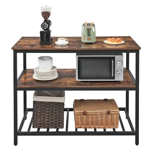 Rymlig köksö med stabil stålram och öppna hyllor i rustik industristil
