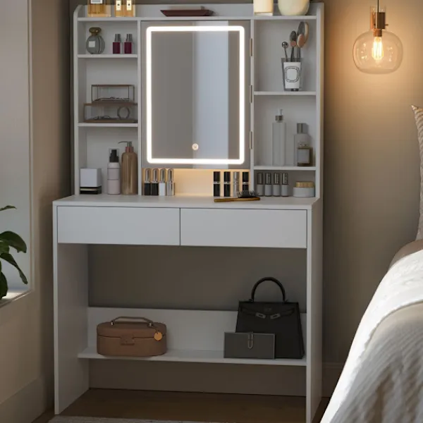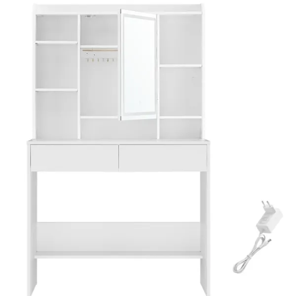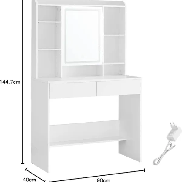 Det generösa förvaringsutrymmet rymmer allt från smink och hudvårdsprodukter till accessoarer. Sminkbordet har en topphylla för parfym, sju öppna fack, två fack och krokar bakom spegeln, en bordsskiva, två lådor samt en bottenhylla. De justerbara hyllorna gör det enkelt att anpassa utrymmet efter produkter i olika storlekar.
