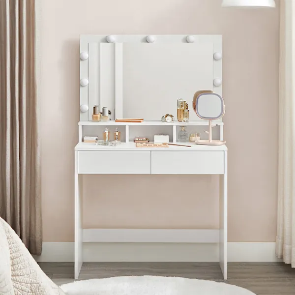 VASAGLE sminkbord kombinerar stil och funktion och ger dig en komplett sminkhörna hemma. De 9 dimbara LED-lamporna runt spegeln skapar ett klart och justerbart ljus som gör det enkelt att sminka sig och styla sig oavsett tid på dygnet.