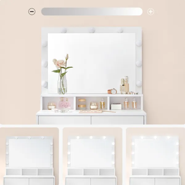 Elegant sminkbord med dimbar belysning och praktisk förvaring