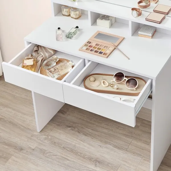 Bordet är utrustat med två lådor och tre öppna fack som rymmer smink, borstar och andra skönhetsprodukter. Den moderna designen i vitt med raka linjer gör att bordet smälter in i alla inredningsstilar.