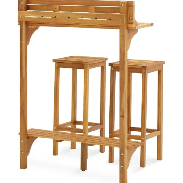 Baren för utomhusbruk kommer bli ett utmärkt tillskott i trädgården eller på uteplatsen då det även kan användas som matbord. Denna balkongbar är tillverkad i massivt akaciaträ med en oljefinish, som gör den stabil och hållbar. Tack vare dess bordsskiva i massivt trä kan den fungera som ett växtställ för att visa dina krukväxter, örter och blommor eller andra dekorationer utomhus, särskilt på mindre balkonger eller uteplatser. Barstolen har fotstöd med utmärkt sittkomfort. De medföljande metallfästena kan användas för att fästa barbordet på balkongräcket. Viktigt: Färger och ådringar varierar från möbel till möbel, vilket gör varje bord unikt; leveransen är slumpmässig.