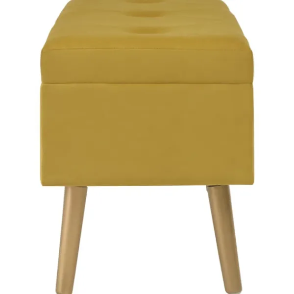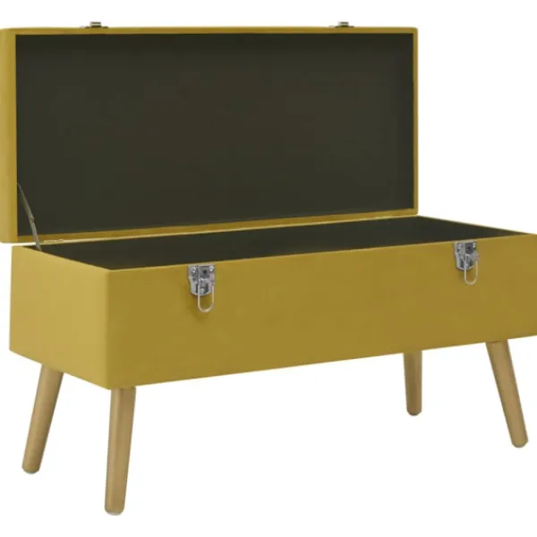Den gula sammetsklädseln är mjuk och mycket mysig samtidigt som den ger din inredning en färgglad detalj. Den har ett inbyggt förvaringsutrymme med extra plats för att förvara dina prylar. De guldfärgade träbenen bidrar dessutom till hallbänkens stabilitet och hållbarhet. Bänken blir en elegant dekoration i din inredning och en oumbärlig del av rummet.