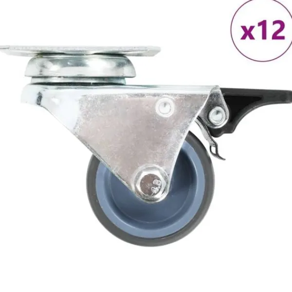 Den här uppsättningen om 12 dubbelhjul, varav hälften har bromsar blir ett bra tillbehör för mindre utrustning och möbler såsom arbetsbänkar, vagnar, soffbord, växtställ, bokhyllor, kundvagnar med mera. Hjulen är tillverkade i TPR (termoplastiskt gummi) som kännetecknas av sitt goda stötdämpande vibrationsmotstånd, som gör dem smidiga och tysta. Dessutom skyddar hjulens mjuka yta ditt golv från repor. Ramen i zinkbelagt järn är högst rostbeständig och bidrar därmed till hjulens stadighet. Hjulen är utrustade med bromsar för flexibel kontroll. Varje hjul har en maximal lastkapacitet på 100 kg.