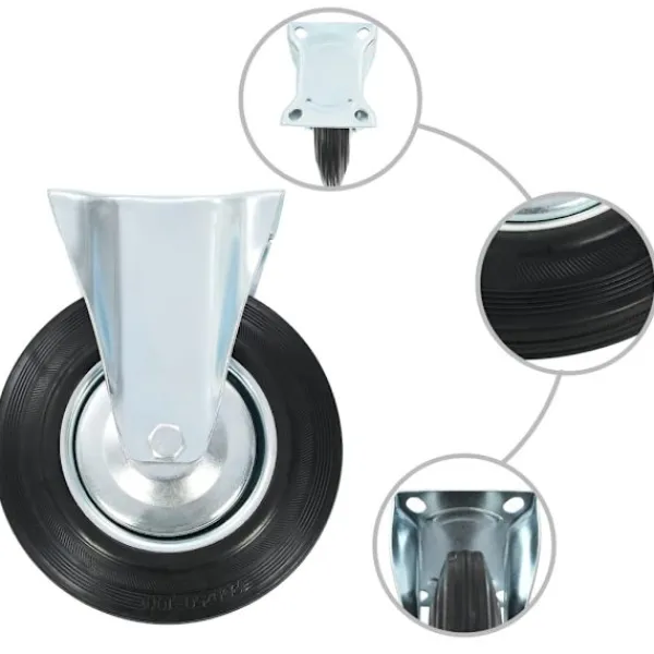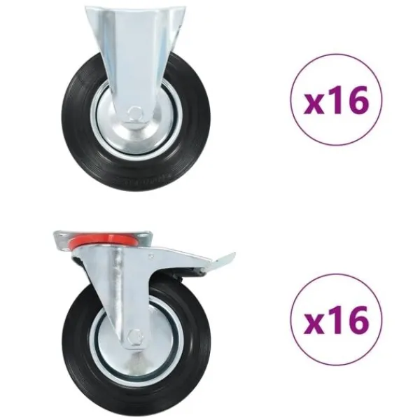 Den här uppsättningen om 32 hjul blir ett bra tillbehör för mindre utrustning och möbler såsom arbetsbänkar, vagnar, soffbord, växtställ, bokhyllor, kundvagnar med mera. Länkhjulen är tillverkade i gummi som kännetecknas av sitt goda stötdämpande vibrationsmotstånd, som gör dem smidiga och tysta. Dessutom skyddar hjulens mjuka yta ditt golv från repor. Ramen i zinkbelagt järn är högst rostbeständig och bidrar därmed till hjulens stadighet. Hälften av dessa hjul är utrustade med bromsar för flexibel kontroll. Varje länkhjul har en maximal lastkapacitet på 180 kg. Vid leverans ingår 16 fasta länkhjul och 16 länkhjul med bromsar.