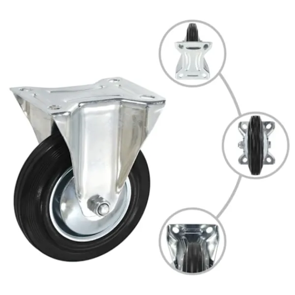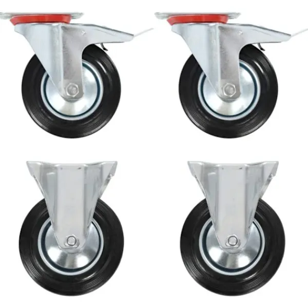 Hjulen är tillverkade i gummi som kännetecknas av sitt goda stötdämpande vibrationsmotstånd, som gör dem smidiga och tysta. Dessutom skyddar hjulens mjuka yta ditt golv från repor. Ramen i zinkbelagt järn är högst rostbeständig och bidrar därmed till hjulens stadighet. Två av dessa hjul är utrustade med dubbla bromsar för flexibel kontroll. Varje hjul har en maximal lastkapacitet på 150 kg.
