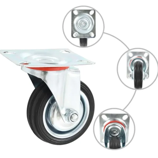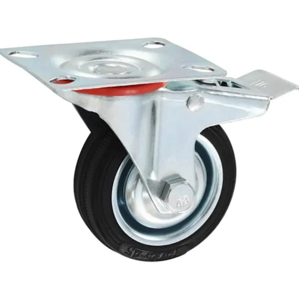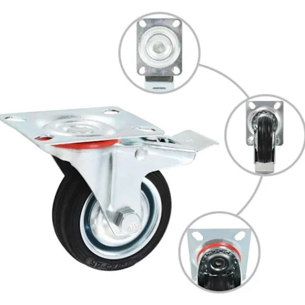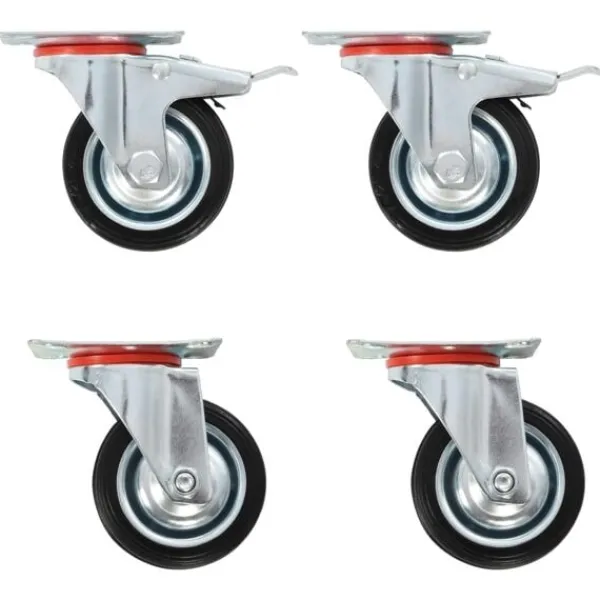 Den här uppsättningen om 4 länkhjul blir ett bra tillbehör för mindre utrustning och möbler såsom arbetsbänkar, vagnar, soffbord, växtställ, bokhyllor, kundvagnar med mera. Länkhjulen är tillverkade i gummi som kännetecknas av sitt goda stötdämpande vibrationsmotstånd, som gör dem smidiga och tysta. Dessutom skyddar hjulens mjuka yta ditt golv från repor. Ramen i zinkbelagt järn är högst rostbeständig och bidrar därmed till hjulens stadighet. Två av dessa hjul är utrustade med dubbla bromsar för flexibel kontroll. Varje länkhjul har en maximal lastkapacitet på 50 kg. Vid leverans ingår 2 länkhjul och 2 länkhjul med dubbla bromsar.