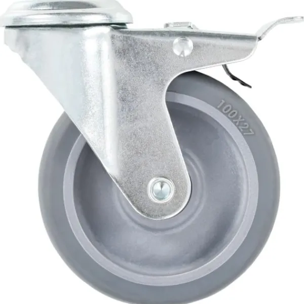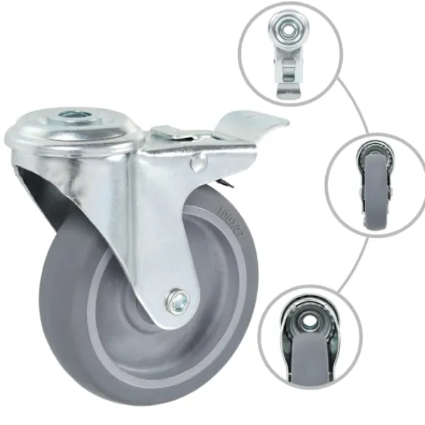 Den här uppsättningen om 4 länkhjul med bulthål och dubbla bromsar blir ett bra tillbehör för mindre utrustning och möbler såsom arbetsbänkar, vagnar, soffbord, växtställ, bokhyllor, kundvagnar med mera. Hjulen är tillverkade i TPR (termoplastiskt gummi) som kännetecknas av sitt goda stötdämpande vibrationsmotstånd, som gör dem smidiga och tysta. Dessutom skyddar hjulens mjuka yta ditt golv från repor. Ramen i zinkbelagt järn är högst rostbeständig och bidrar därmed till hjulens stadighet. Dessa hjul är utrustade med dubbla bromsar för flexibel kontroll. Varje hjul har en maximal lastkapacitet på 60 kg. Vid leverans ingår 4 länkhjul med bulthål och dubbla bromsar.
