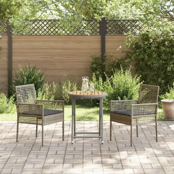 Ge ditt utomhusutrymme en modern vibe med det här trädgårdsbistrosetet som är gjort av hållbar Poly Rattan. Setet passar perfekt i trädgården eller på terrassen och erbjuder en mix av stil och funktionalitet med sina rena linjer. Att njuta av en kopp kaffe på morgonen eller ha gäster kommer bli en lyxig upplevelse. Den snygga vävda texturen i Poly Rattan ihop med akaciaträets jordnära färger ger en känsla av lugn och modern elegans.
