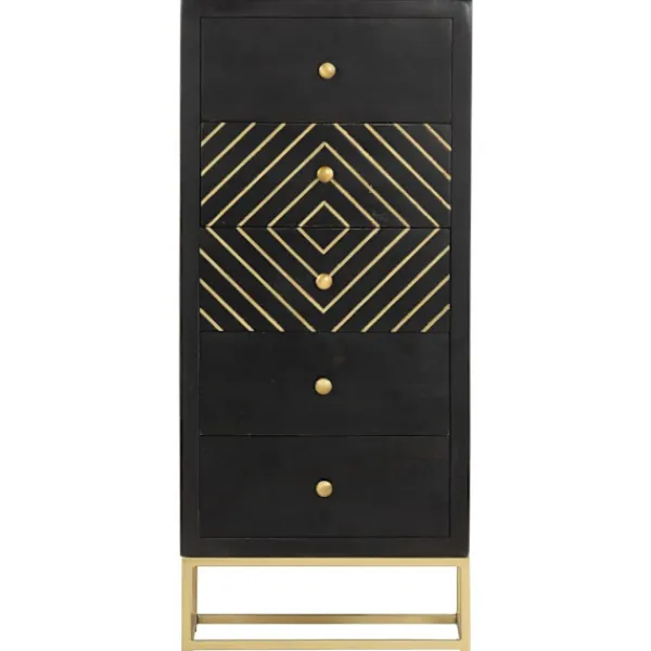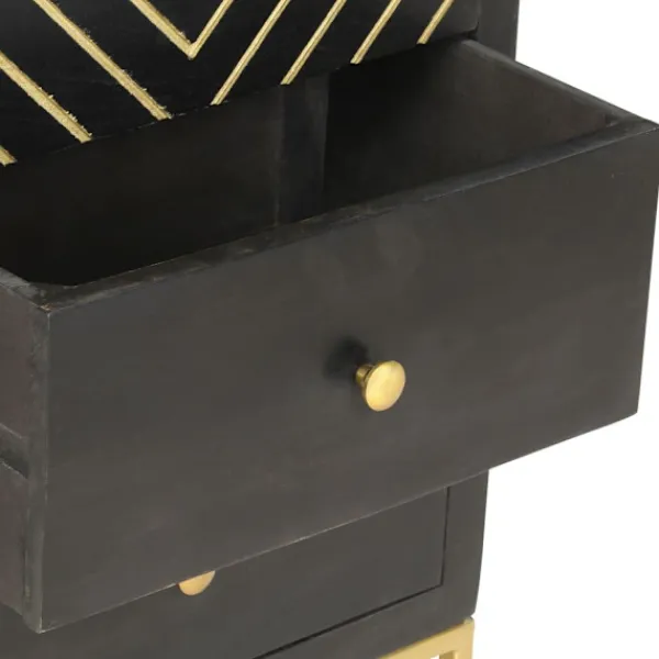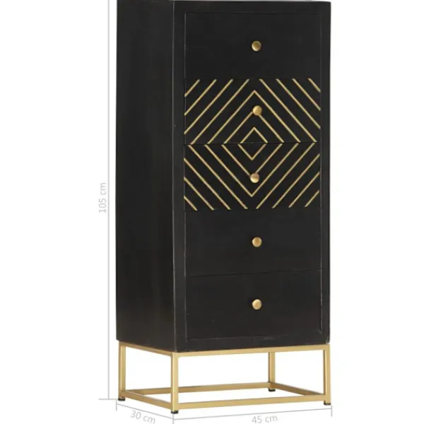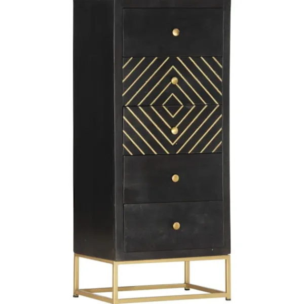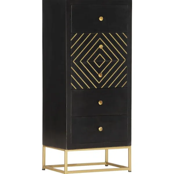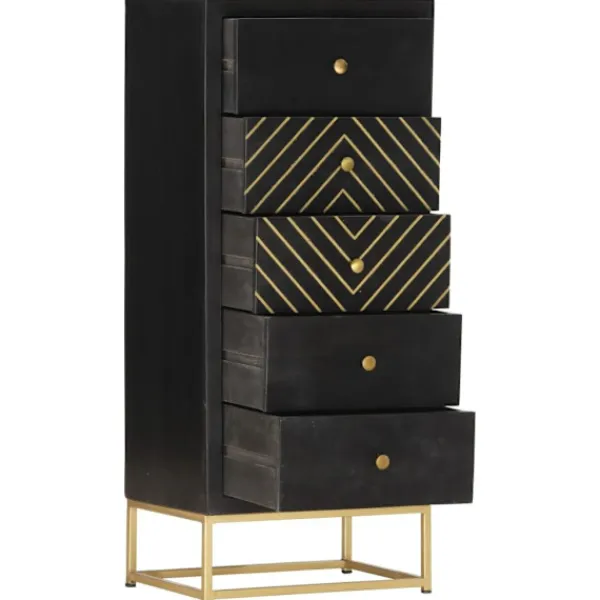 Vår träbyrå har en svart och gyllene finish och blir ett blickfång i din inredning. Byrån är tillverkad i massivt mangoträ som är stabilt och hållbart. Den pulverlackerade stålramen bidrar till dess stadighet. Hantverket och de vackra träådringarna gör varje möbel unik och något olik de andra. Dessutom har skänken 5 lådor med plats för att förvara kläder, böcker och andra saker. Obs: Färgerna varierar från möbel till möbel vilket gör varje möbel unik och något annorlunda än de andra. Leveransen är slumpartad.