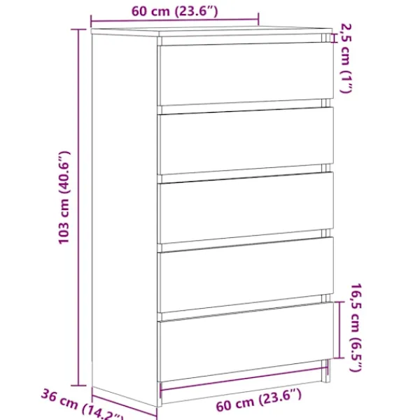 Den här lilla byrån utstrålar en elegant charm och blir en vacker detalj i din inredning. Hållbart material: Det konstruerade träet är av exceptionell kvalitet med slät yta och är också starkt, stabilt och fuktbeständigt.Rymligt förvaringsutrymme: Byrån har 5 lådor. De rymliga lådorna håller dina saker organiserade.Robust ovansida: Dess robusta ovansida är perfekt för att placera krukväxter, inramade foton och andra dekorativa föremål.Lätt att rengöra ytan: Byrån är lätt att rengöra med en fuktig trasa. Varning:För att förhindra att den välter måste denna produkt användas med den medföljande monteringsanordningen för vägg Observera:Varje produkt levereras med en monteringsmanual i lådan för enkel montering.