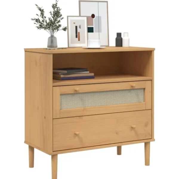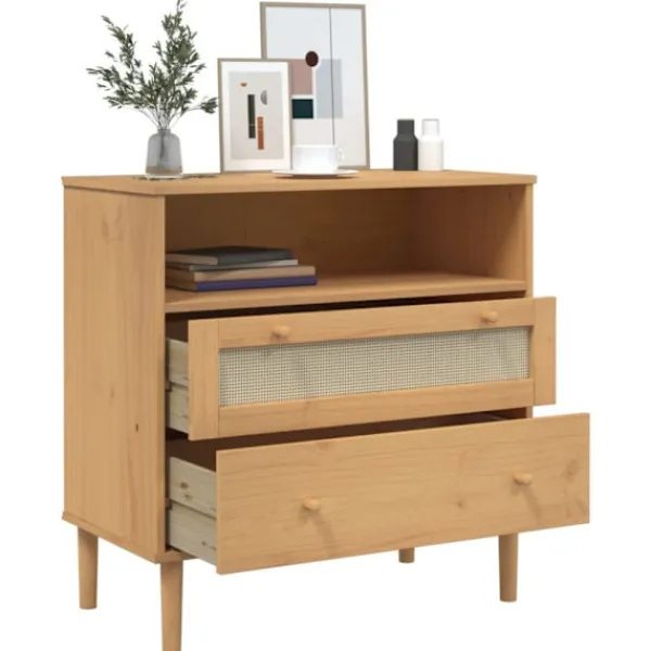 - Yta i rottingutseende: Sidobordets övre lådfront är handgjord av polyrotting, en tvåfärgad blandning av modernt och boho från mitten av århundradet som ger en mysig men ändå elegant touch i din inredning.