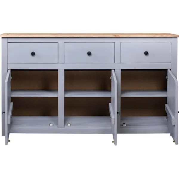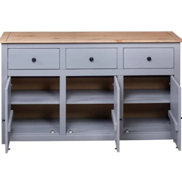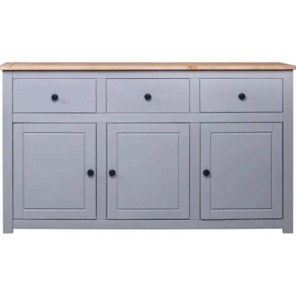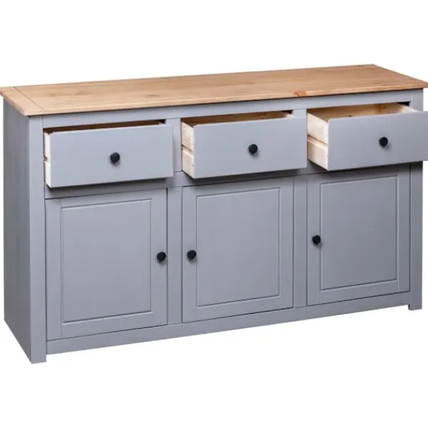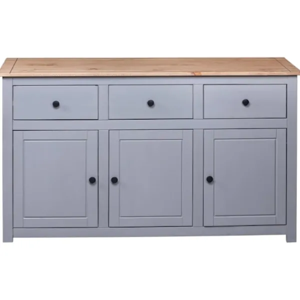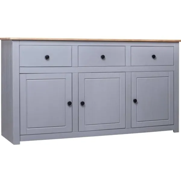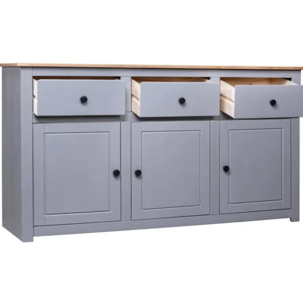Denna praktiska skänk i massivt furuträ har en elegant utstrålning! Denna skänk är tillverkad i massiv furu och är ytterst hållbar och stadig. Den erbjuder stort förvaringsutrymme med sina 3 lådor och 3 utrymmen. Den robusta bordsskivan är perfekt för att visa upp dekorativa föremål, fotoramar eller krukväxter. Den kan enkelt torkas av med en torr trasa. Skänken är enkel att montera.