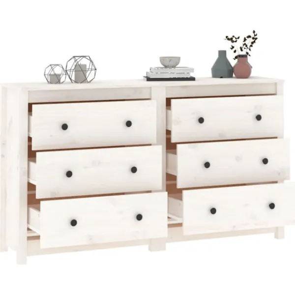 Njut av ett organiserat vardagsrum med denna skänk i trä! Denna praktiska skänk kommer att uppfylla dina olika behov och är perfekt att ha i alla sorters rum. Massivt furuträ: Massivt furuträ är ett vackert naturmaterial. Furuträ har raka fibrer, och knutarna ger materialet sin rustika utstrålning.Gott om förvaring: Skåpet har gott om förvaringsutrymme för att hålla dina olika saker välorganiserade och inom räckhåll.Robust ovansida: Dess robusta ovansida är perfekt för att ställa dekorativa föremål, fotoramar eller krukväxter på. Varning:För att förhindra att den välter måste denna produkt användas med den medföljande monteringsanordningen för vägg Observera:Varje produkt levereras med en monteringsmanual i lådan för enkel montering.Skänken består av två små skänkar.