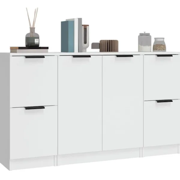 Denna skänk med minimalistisk charm kommer att uppfylla dina olika behov och är perfekt att ha i alla sorters rum. Lättskött material: Skänken är tillverkad av konstruerat trä som är lätt att rengöra. Det konstruerade träet är av exceptionell kvalitet med slät yta och är också starkt, stabilt och fuktbeständigt.Rymligt förvaringsutrymme: Förvaringsutrymmet gör det enkelt att hålla saker organiserade.Multifunktionell: Den stabila ovansidan är perfekt för att visa upp dekorativa föremål, fotoramar eller krukväxter. Den kan också användas som konsolskåp, sidoskåp etc. Observera:Varje produkt levereras med en monteringsmanual i lådan för enkel montering. Varning:För att förhindra att den välter måste denna produkt användas med den medföljande monteringsanordningen för vägg
