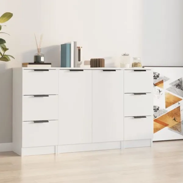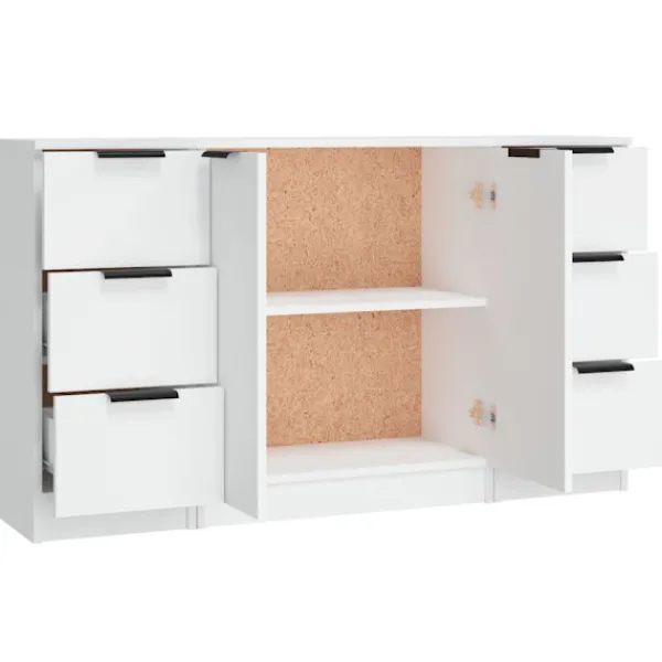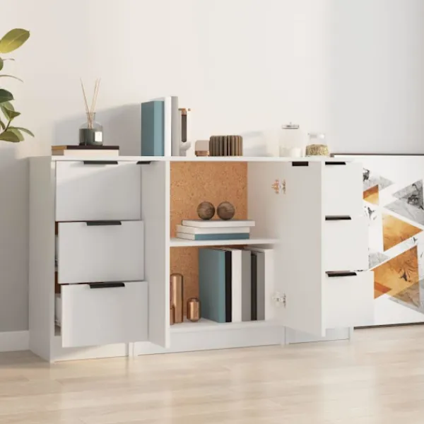 Denna skänk med minimalistisk charm kommer att uppfylla dina olika behov och är perfekt att ha i alla sorters rum. Lättskött material: Skänken är tillverkad av konstruerat trä som är lätt att rengöra. Det konstruerade träet är av exceptionell kvalitet med slät yta och är också starkt, stabilt och fuktbeständigt.Rymligt förvaringsutrymme: Förvaringsutrymmet gör det enkelt att hålla saker organiserade.Multifunktionell: Den stabila ovansidan är perfekt för att visa upp dekorativa föremål, fotoramar eller krukväxter. Den kan också användas som konsolskåp, sidoskåp etc. Observera:Varje produkt levereras med en monteringsmanual i lådan för enkel montering. Varning:För att förhindra att den välter måste denna produkt användas med den medföljande monteringsanordningen för vägg