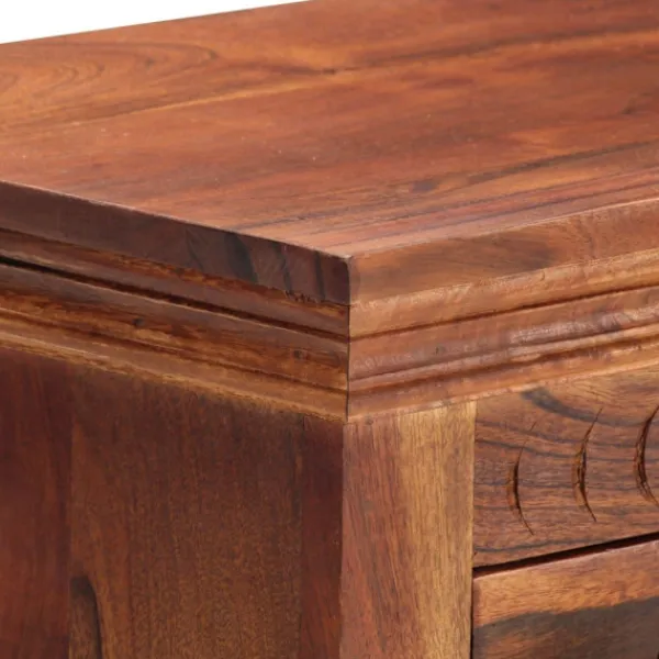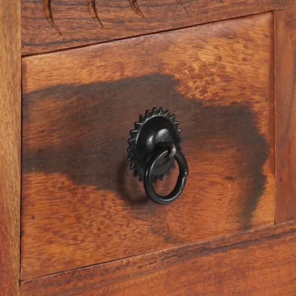 Denna träskänk utstrålar en rustik charm och blir ett tidlöst tillägg i ditt rum. Sidobordet är tillverkat av massivt akaciaträ som är väldigt stabilt och hållbart. Dess stadiga ovansida är perfekt för att ställa dekorativa föremål som vaser eller krukväxter. Skåpet har gott om förvaringsutrymme för att förvara dina olika prylar. De unika dekorativa mönstren bidrar till skänkens moderna charm. Produkten kräver ingen montering. Observera: Träets färger och ådringar kan variera från möbel till möbel vilket gör varje möbel unik och något annorlunda från nästa. Leveransen är slumpartad, vilket säkerställer varje produkts exklusivitet och individualitet.
