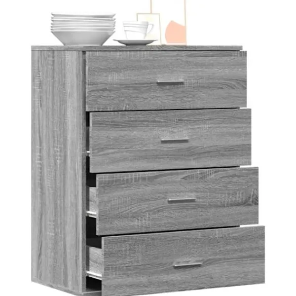 - Hållbart material: Det konstruerade träet är av exceptionell kvalitet med slät yta och är också starkt, stabilt och fuktbeständigt. Skänken är tillverkad av konstruerat trä och är lätt att rengöra med en fuktig trasa.