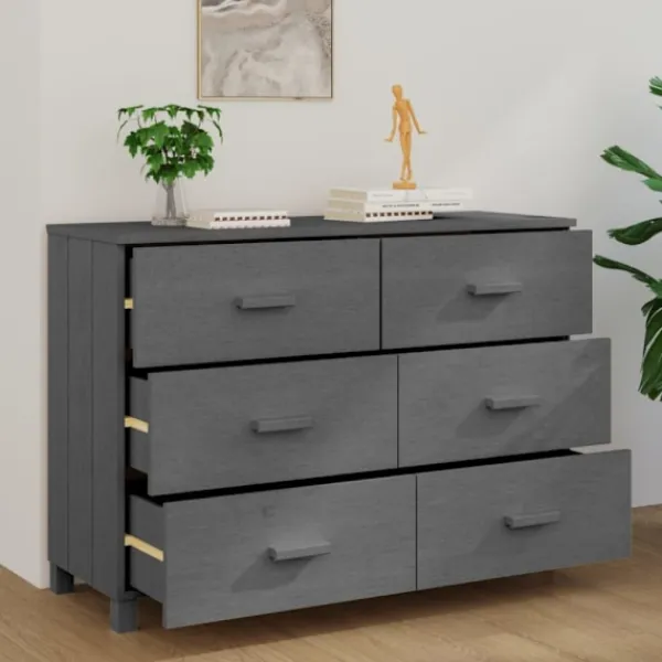 Skåpet är tillverkat i massivt furuträ, vilket gör det stabilt och robust. Skåpet har 6 lådor med gott om förvaringsutrymme för att hålla dagliga väsentligheter organiserade och inom räckhåll. Dessutom är den robusta bordsskivan perfekt för att visa upp dekorativa föremål, fotoramar och krukväxter.