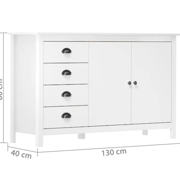 Håll allt organiserat i din inredning med vår eleganta skänk. Skänken är tillverkad i massiv furu som gör den stabil och stadig. Tack vare dess två dörrar och 4 rymliga lådor med skålhandtag erbjuder den gott om förvaringsplats för att hålla dina olika föremål i perfekt ordning och inom räckhåll.
