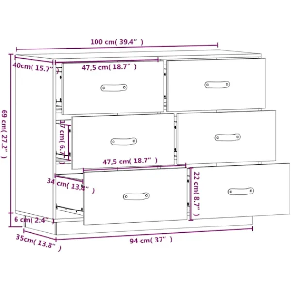 Denna trendiga och praktiska byrå uppfyller dina olika krav och blir ett perfekt tillskott i ditt rum. Massivt furuträ: Massivt furuträ är ett vackert naturmaterial. Furuträ har raka fibrer, och knutarna ger materialet sin rustika utstrålning.Stabil ram: Träramen säkerställer robusthet och stabilitet.Gott om förvaringsutrymme: Skänken har 6 lådor med tillräckligt med utrymme för att du ska kunna hålla saker organiserade och inom räckhåll.Robust toppskiva: Toppskivan är perfekt för att visa upp dekorationer, foton och krukväxter. Varning:För att förhindra att den välter måste denna produkt användas med den medföljande monteringsanordningen för vägg Observera:Varje produkt levereras med en monteringsmanual i lådan för enkel montering.